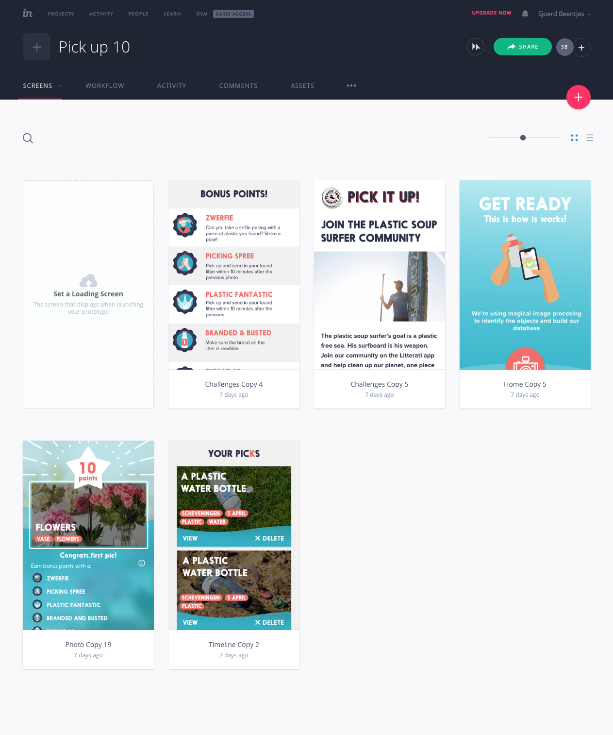 Tijdens het huidige proces worden bij een project alle ontwerpen aan de muur gehangen. Zo'n overzicht moet binnen de applicatie ook bestaan, zodat gebruikers kunnen zien welke schermen er allemaal zijn. In bestaande apps waar met schermontwerpen wordt gewerkt bestaat zo'n overzicht ook.